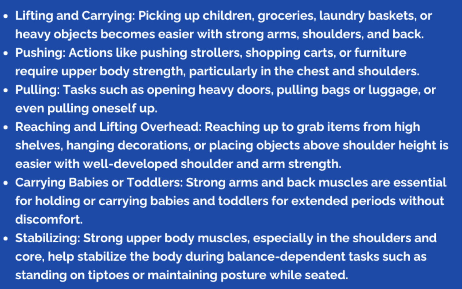 Increases Functional Strength: Daily activities like lifting, carrying, and pushing become easier and more efficient with a strong upper body.