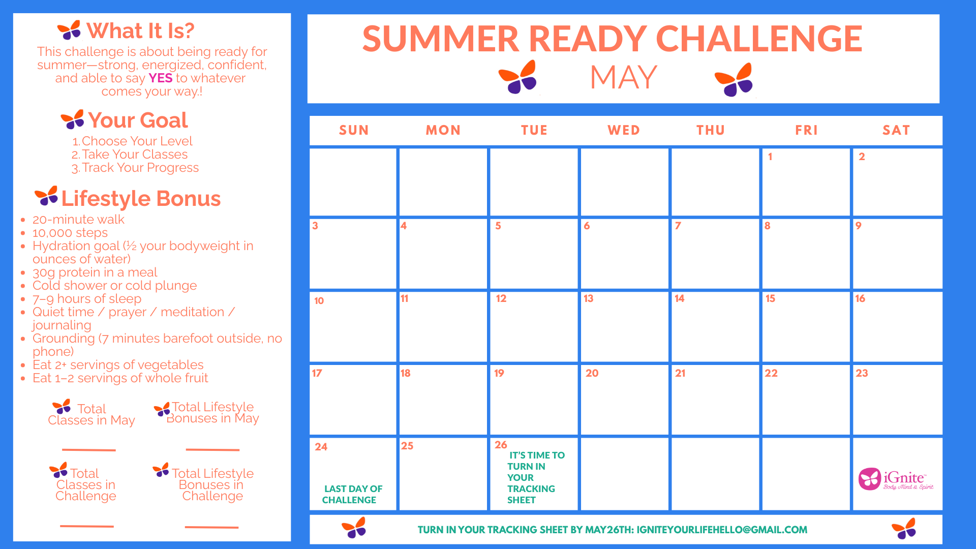 We’re heading into one of the most fun and energizing times of year—and we’re kicking it off with our Summer Ready Challenge! This challenge isn’t just about looking good for summer (although you will ). It’s about being ready for summer—strong, energized, confident, and able to say YES to whatever comes your way. Hiking, biking, swimming, beach days, travel, adventure…When your body feels strong, your answer becomes YES!
